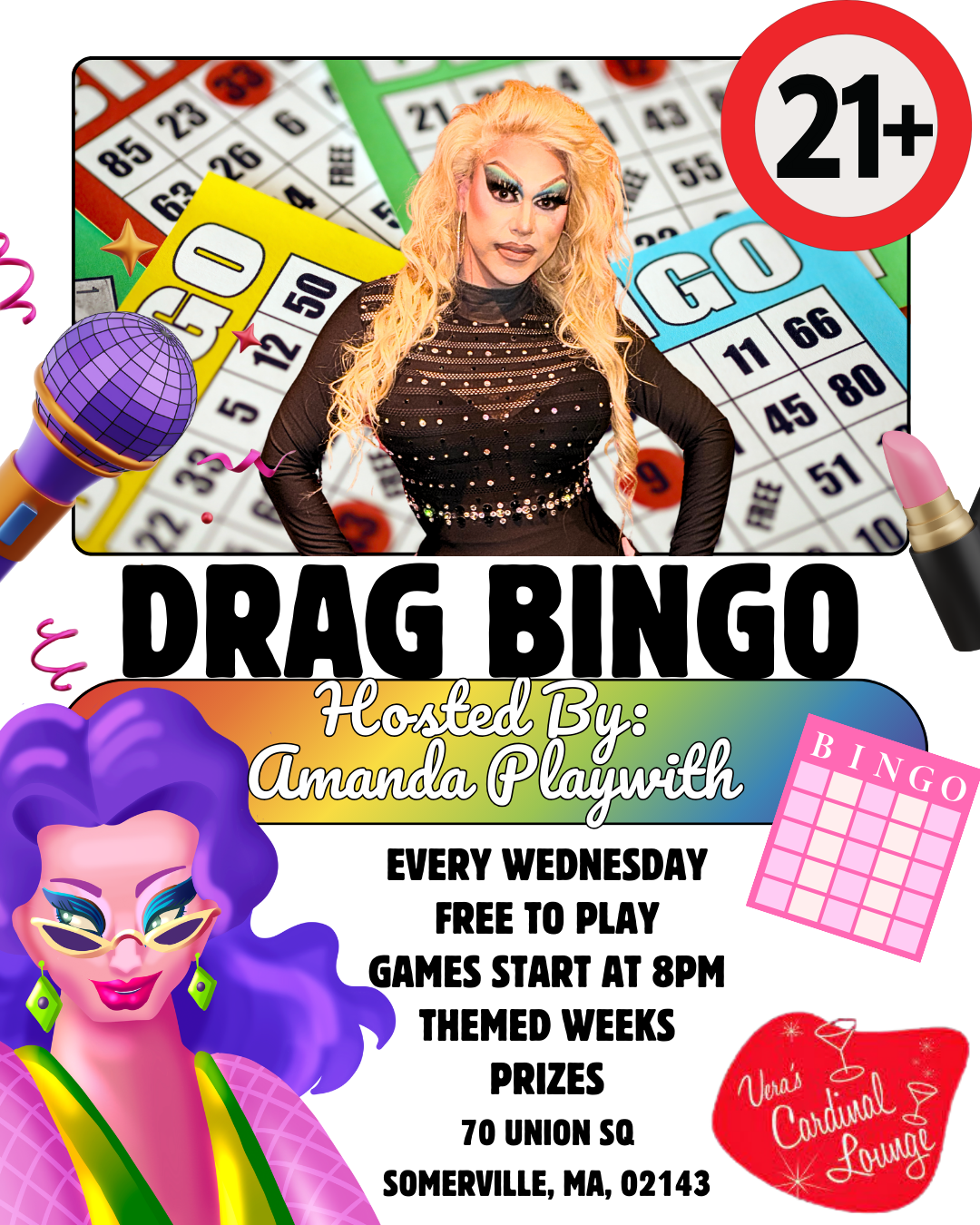 Join Amanda Playwith on Wednesdays at Vera’s In Union Square Somerville for Drag Bingo! FREE to play. Bingo Starts at 8pm